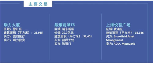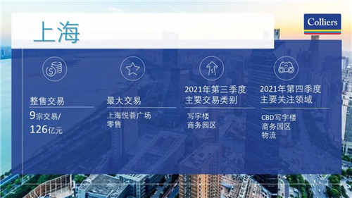 上海三季度完成9筆交易,總交易額為126億元。自用買家仍是寫字樓和商務園區資產最活躍的買家,投資交易則包括零售和公寓資產。