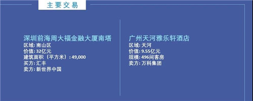 深圳錄得2筆交易,總價值為33.3億元,其中包括匯豐購得南山區的一棟49,000平方米的寫字樓。廣州錄得1筆交易,為天河區一成交額為9.55億元的酒店項目。