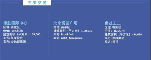 世茂工三商場被中植集團旗下子公司以16.5億元收購。Brookfield完成對悅薈中國零售資產包的收購,其中包括位于昌平區的北京悅薈廣場。凱龍以19.5億元購得面積為38,000平方米的寫字樓德勝國際中心。