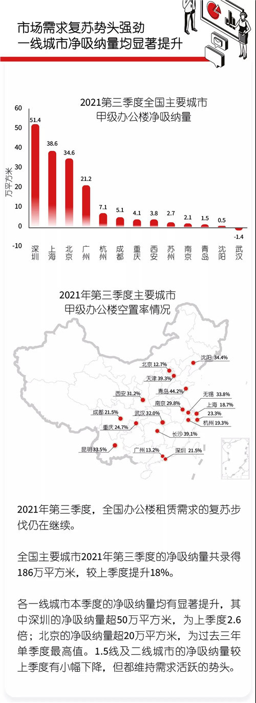 近日,仲量聯行發布2021年第三季度全國辦公樓市場概覽指出,三季度,全國寫字樓整體市場需求復蘇加速,全國租金表現趨穩,“雙減”政策對一線城市甲級辦公樓影響有限。