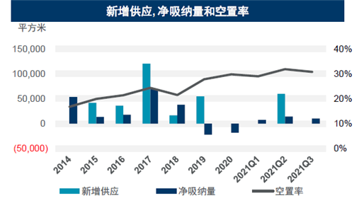第三季度,大連市零售市場無新增供應入市,總存量依舊維持在188.8萬平方米,且該存量或將維持至2022年。