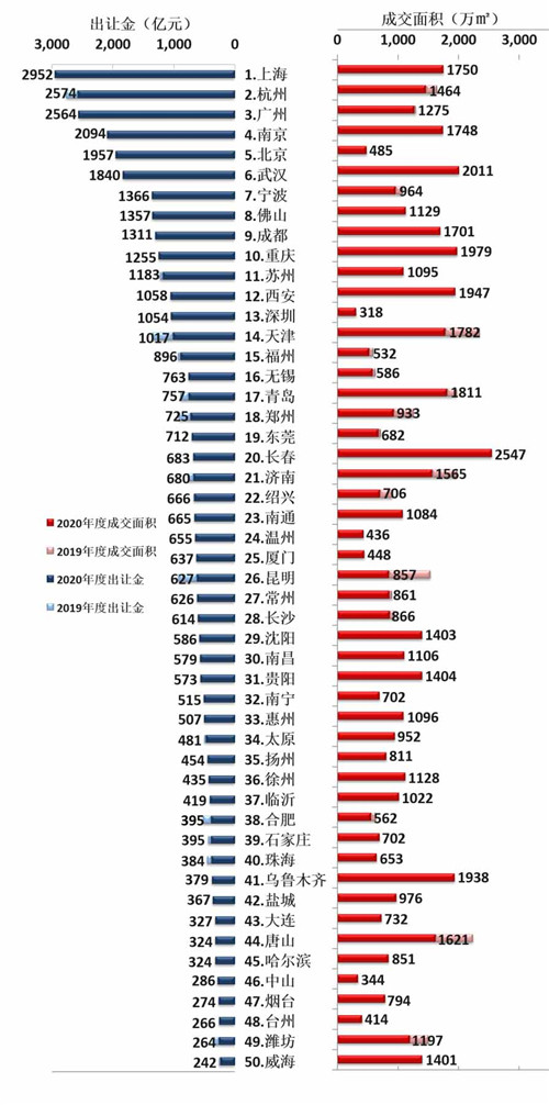 2020年,全國300城市土地出讓金總額為59827億元,同比增加16%。一線城市土地供需兩旺,攬金總額同比上漲逾四成,北上廣深收金同比均上漲;二線城市供求同比小幅上漲,樓面均價基本持平。出讓金榜單收金水平同比上行,前十城市年度收金均突破千億,上海年度收金總額2952億元,位列榜首。三四線城市共20城入榜,佛山、東莞入圍前榜單前20。