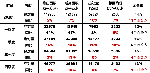 2020年,全國300城市土地供應(yīng)同比上漲5%,成交量同比上漲7%,樓面均價和出讓金同比上行,平均溢價率基本持平。住宅用地成交樓面價增近一成,平均溢價率微漲。