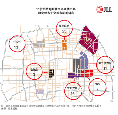 而北京作為中國大陸唯一進入榜單前十名的城市,除了金融街、CBD和中關村,還有多個租金水平靠前的子市場未納入追蹤范圍,如果對比全球最貴辦公樓市場租金水平來看,這些主要商圈也足以進入全球前30。