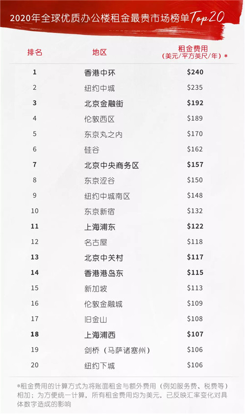 在仲量聯行2020年全球《優質辦公樓租金追蹤指數報告》中,全球最貴辦公樓市場租金也呈現整體下滑趨勢,平均降幅達3.0%,但各地區最貴辦公樓的租金差距有明顯縮小。香港中環地區、北京金融街和北京中央商務區依然位列十大最貴辦公樓市場。
