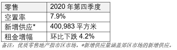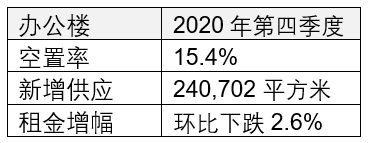 四季度共有兩個新項目入市,但目前項目入住率相對較低,推升甲級辦公樓整體空置水平。2020年底,全市空置率達到15.4%。雖然CBD核心區和麗澤的部分項目進一步延遲入市時間,在一定程度上緩解了業主承受的供給壓力,但租賃活動放緩仍然對市場構成挑戰——部分租戶繼續選擇縮減規模,或采取各種策略積極尋求降低房地產成本。