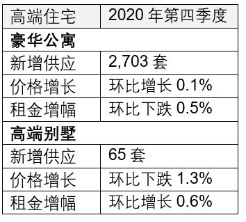 延續三季度市場趨勢,年底購房需求持續回暖,充足的新增供應推動成交量穩定回升。許多開發商在年底前加大推廣力度和價格優惠,以價換量,帶動成交量上升。受此影響,2020年全年豪華公寓成交量達到1,934套,較未受新冠影響的2019年僅同比微降0.9%。另一方面,四季度共有2,703套豪華公寓集中入市,環比大幅增長121.2%,單季度供給量錄得八年最高水平,并推動全年豪華公寓供應總量也升至八年最高水平。