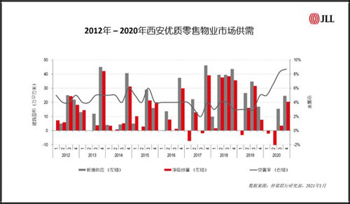 受疫情影響,西安全年優(yōu)質(zhì)零售商業(yè)的凈吸納量僅4.8萬平方米。而傳統(tǒng)零售項目面對新型體驗式購物中心的興起以及線上電商的沖擊,承受更大的挑戰(zhàn),加速邁入變革期。2020年零售物業(yè)市場整體承壓,需求端有所放緩,全市零售物業(yè)平均空置率升至8.7%,同比增長4.0個百分點;購物中心首層零售平均租金報385.5元/平方米/月,同比減少1.3%。