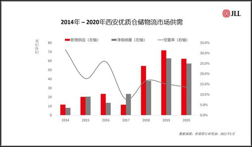2020年,包括安博灃西物流園、普洛斯西安賀韶物流園、維龍秦漢物流園、深國際西安綜合物流港、瀚溥經(jīng)開物流園、遠洋秦漢物流園在內(nèi)的共計9個高標(biāo)倉庫項目交付使用。全年新增供應(yīng)達62.4萬平方米。