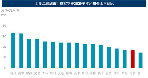 2021年,將有62.2萬平方米的甲級寫字樓計劃供應入市,其中鳳嶺占比56%,將為成熟商務區發展注入新活力。戴德梁行研究院副院長、華南研究部董事張曉端指出,考慮到商辦項目延期較為普遍且業主大面積自用等因素,預計明年實際投放市場的供應量將大幅低于計劃供應量。張女士同時表示,縱觀國內部分二線城市的租金水平,南寧甲級寫字樓的租金水平暫時處于相對低位,即便與同處于西部的昆明、貴陽相比也有兩成以上的差距,對于企業而言大大節省了辦公成本。