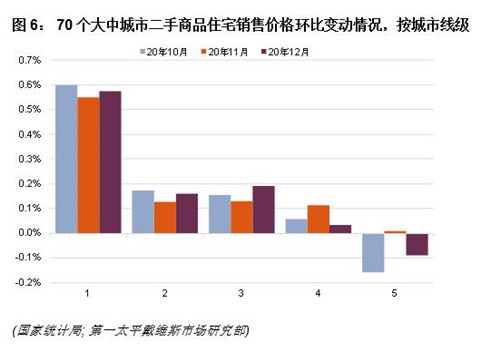 二手商品住宅價格走勢與一手市場類似,12月環(huán)比上漲0.12%。一線城市二手住宅市場表現(xiàn)仍舊優(yōu)于一手市場以及其他線級城市二手市場。二、三線城市價格增長有所提速,但幅度甚微。