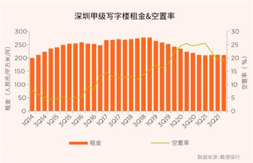 戴德梁行近日發布深圳寫字樓市場報告顯示,2021年深圳寫字樓市場延續活躍姿態,四季度吸納量推高全年數值至67.2萬平方米,同比上升66.8%。