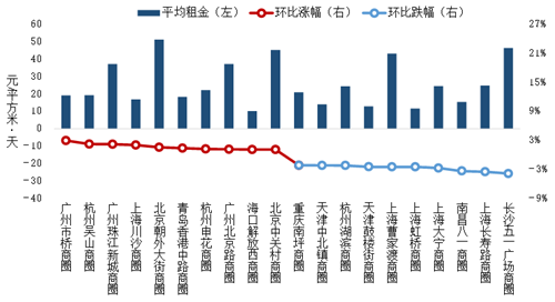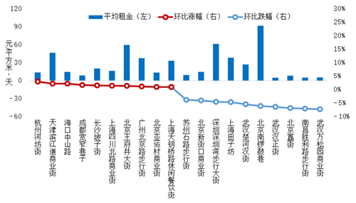 從漲跌個數來看,在樣本商業街中,租金環比上漲的商業街占33.3%,租金環比下跌的商業街占47.0%,19.7%的商業街租金與上期持平;在樣本商圈(購物中心)中,租金環比上漲的商圈占40.0%,租金環比下跌的商圈占50.5%,9.5%的商圈(購物中心)租金與上期持平。