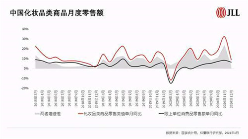 化妝品之于女性消費屬于“基本品消費”,尤其是年輕一代在美妝、護膚方面的觀念十分前衛,亦不局限于國際一線大牌,國貨商品的高性價比和品質提升,足以吸引年輕消費者。作為零售物業快速擴張三大業態之一,化妝品牌坪效高、客流效應明顯,備受購物中心青睞,已成為其首層業態調整的主流租戶。疫情后,化妝品類的銷售額增速與市場均值的差距進一步拉大,顯示出這一細分市場的巨大潛力。