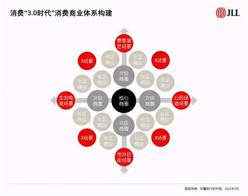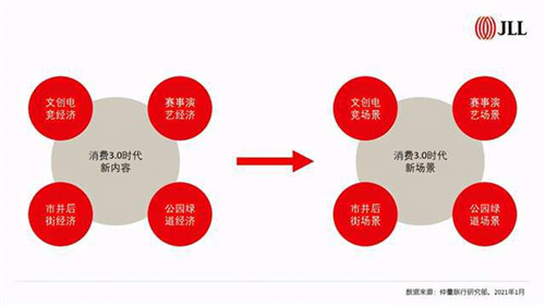 仲量聯行在2020年已提出“中國邁入消費3.0時代”的研究視角,具體請參見《“消費內循環”模型與“消費3.0”》一文。在消費3.0時代,新的消費內容創造更具多元性的消費場景,而新的消費場景反過來在補充完善傳統購物中心消費場景的同時,讓多元化物業載體煥新升級,承載更多現代化消費場景,比如文創電競、賽事演繹、市井后街、公園綠道等等以及更多尚待發掘、尚且未知的“X場景”。