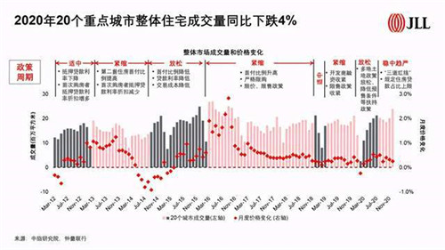 在房地產政策方面,2020年上半年多地出臺房地產扶持政策,整體政策環境偏寬松。下半年,隨著不少城市住宅市場加速回暖,部分熱點城市房價、地價增長過快,中央再次強調“房住不炒”,房地產調控政策穩中趨嚴。在三季度國家出臺“三道紅線”政策收緊房企融資后,四季度央行、銀保監會發布房地產貸款新制度,規定各大銀行房地產貸款和個人住房貸款占比上限。