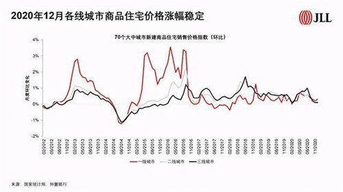 在價格方面,國家統計局數字顯示,2020年12月份70個大中城市新建商品住宅銷售價格漲幅總體穩定。12月份,4個一線城市新建商品住宅銷售價格環比上漲0.3%,漲幅比上月擴大0.1個百分點;二線和三線城市新建商品住宅銷售價格環比均上漲0.1%,漲幅均與上月相同。全年來看,一線城市新建商品住宅銷售價格同比上漲3.9%,二線和三線城市新建商品住宅銷售價格分別同比上漲4.0%和3.5%,漲幅均超過2019年。