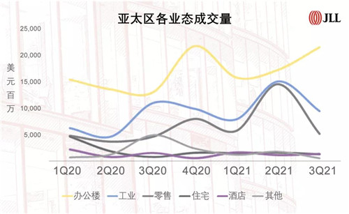 前三季度亞太區(qū)商業(yè)地產(chǎn)投資交易額達(dá)1250億美元,較去年同期增長(zhǎng)30%,其中第三季度投資交易額為395億美元,同比增長(zhǎng)10%;但由于多個(gè)國(guó)家地區(qū)仍然受到疫情后復(fù)蘇受阻等因素影響,第三季度環(huán)比下降23%。