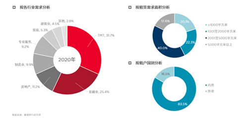 截至2020年第四季度,廣州甲級寫字樓市場空置率同比上升2.6個(gè)百分點(diǎn)至8.1%,為一線城市中最低。同時(shí),廣州租金的跌幅也最小,僅同比下降5.4%至180.4元每月每平方米。年初受新冠疫情影響,企業(yè)租賃意愿減弱,退租和空置增加;下半年企業(yè)搬遷意愿逐步增強(qiáng),業(yè)主普遍愿意提供更大的議價(jià)空間加速去化,多重因素刺激下市場活躍度有所上升。但是企業(yè)搬遷仍以成本控制為主要考慮。受疫情和整體經(jīng)濟(jì)環(huán)境影響,外資租戶活動有所放緩,年以內(nèi)資租戶主導(dǎo)市場需求。TMT和金融業(yè)為全年兩大主力需求來源,占比分別高達(dá)32%和25%。