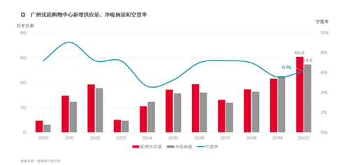 回顧2020全年,在度過前兩季度的低迷之后,隨著疫情的控制,廣州優(yōu)質(zhì)購物中心市場逐步回暖,展現(xiàn)強(qiáng)勁勢頭。在新增供應(yīng)達(dá)十年高峰至60.6萬平方米的情況下,吸納量同時(shí)攀升至54.6,亦達(dá)十年之最。新項(xiàng)目良好的招商進(jìn)展及年底前商家積極拓店擴(kuò)張是實(shí)現(xiàn)吸納高峰的主因。截至第四季度,新增供應(yīng)量小幅推動空置率上升0.6個(gè)百分點(diǎn)至6.1%,全市租金結(jié)構(gòu)性同比下降3.6%。