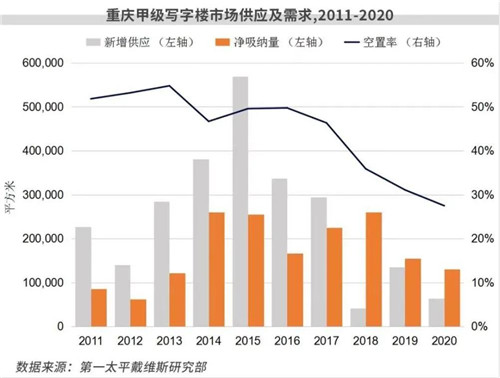 據第一太平戴維斯數據,2020年,重慶甲級寫字樓市場新增供應僅6.4萬平方米,在疫情影響下,項目交付延遲,新增供應量有所下降。來福士A座成為唯一的新增供應項目,推高總存量至240萬平方。隨著四季度結束,全年平均租金85.5元/平方米/月,同比下降0.9%,降幅明顯收窄;全年空置率同比下降3.6%,跌至27.5%,在京滬創十年新高的同時,新一線重慶創十年新低。同時,凈吸納量由負轉正,寫字樓租賃需求不斷新增。