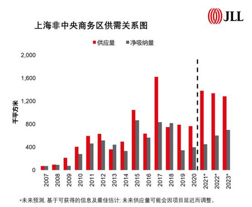 據(jù)仲量聯(lián)行統(tǒng)計數(shù)據(jù)顯示,2020年全年上海甲級辦公樓凈吸納量為40.7萬平方米,在成本控制型需求和總部整合需求的支撐下,其中上海非中央商務區(qū)2020全年凈吸納量錄得39.7萬平方米。