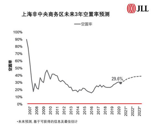 然而,要想真正驅(qū)散疫情所帶來的影響,并非一朝一夕之事。去年全年,上海非中央商務區(qū)新增供應為76.3萬平方米,未來3年內(nèi)預計將有400萬平方米辦公面積入市,疫情和新增供應令市場不斷承壓,非中央商務區(qū)2020年全年空置率小幅上升2.2個百分點達29.6%,但仲量聯(lián)行預計,面對租戶依舊謹慎保守的租賃策略、租金持續(xù)下跌的需方市場,上海非中央商務區(qū)供需不平衡的問題極有可能在2021年之后被進一步放大,或?qū)е驴罩寐世^續(xù)走高,或達35%-40%左右。