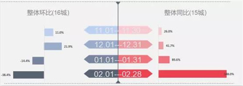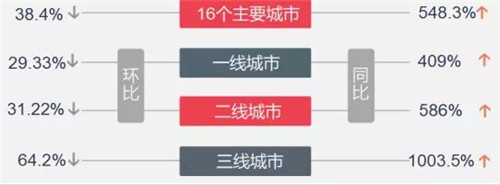 二月一線城市整體環(huán)比下降29.33%,廣州降幅較大,約為46%;上海居二位,降幅為34%,深圳降幅22.2%,位列第三。同比來看,整體成交上行,升幅為409%,其中廣州升幅顯著,為623%;北京升幅居次位,為413%。