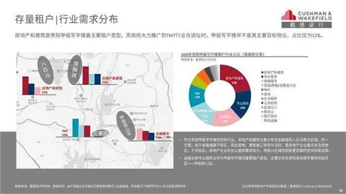分區(qū)域來看,房地產(chǎn)建筑主要分布在金融城和八匹馬兩大區(qū)域。另一方面,由于金融城屬于新區(qū),拿地、建筑施工等較為活躍,是房地產(chǎn)企業(yè)重點(diǎn)關(guān)注的地區(qū);不僅如此,房地產(chǎn)企業(yè)對辦公面積需求較大,而新興區(qū)域的則有更足夠的空間供其選擇。金融業(yè)和專業(yè)服務(wù)業(yè)作為甲級寫字樓的重要租戶類型,主要分布在貴陽商務(wù)樓宇最早的起步區(qū)——傳統(tǒng)核心區(qū)。