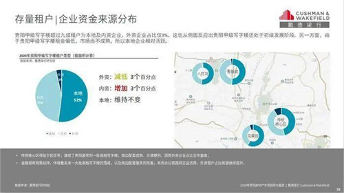 從租戶企業(yè)資金來源分析,貴陽甲級寫字樓超過九成租戶為本地及內(nèi)資企業(yè),外資企業(yè)占比僅3%。這也從側(cè)面反應(yīng)出貴陽甲級寫字樓還處于初級發(fā)展階段。另一方面,由于貴陽甲級寫字樓租金偏低,市場尚不成熟,所以本地企業(yè)相對活躍。分區(qū)來看,傳統(tǒng)核心區(qū)得益于起步早,建成了貴陽最早的一批高檔寫字樓,周邊配套成熟、交通便利,因而外資企業(yè)占比全市最高;金融城有政策扶持,伴隨著未來一大批高檔寫字樓的落成,以及周邊配套服務(wù)的完善,商務(wù)辦公氛圍將日益濃厚,外資租戶占比有望繼續(xù)提升。