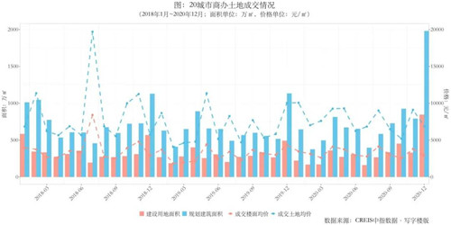2020年全年,20城市商辦用地推出面積大幅增加,推出土地和樓面均價同比上漲。尤其年底供應量井噴式增長。成交方面量價齊升;土地出讓金同比增長21.39%,平均溢價率降至2.06%。從企業拿地情況來看,2020年國內82家企業共競得484宗商辦用地,拿地面積1852.24萬㎡,金額1181.53億元。