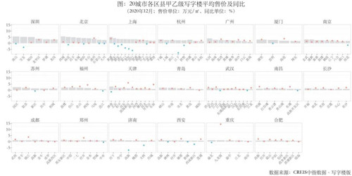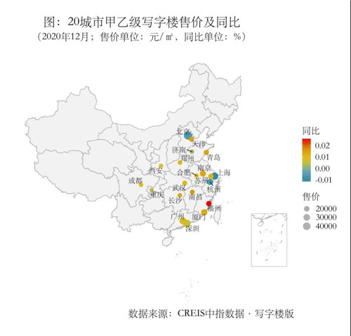 2020年經歷疫情考驗,大宗交易較往年趨近冷靜,但市場依舊穩健。散售市場方面,截至2020年12月,20城市甲乙級寫字樓平均售價為21059元/㎡,同環比分別為0.88%和-0.008%。大宗交易方面,全年國內49個城市共錄得237宗商辦物業大宗交易,總成交額達到2041.02億元,成交面積1288.12萬㎡,成交額較2019年同比下跌近三成。