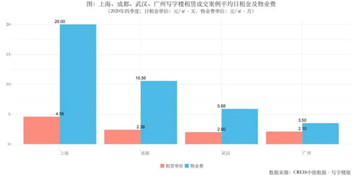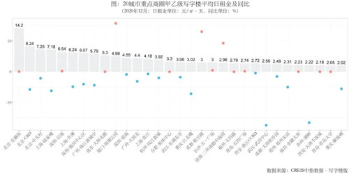 2020年,在下半年疫情基本得到控制、經濟逐步復蘇、企業復工復產的利好因素影響下,四季度多城市租金降幅有所收窄。從租金報價來看,20城市寫字樓租金仍處于下行通道但整體企穩,平均租金為2.70元/㎡·天,租金跌幅明顯收窄并趨于穩定,空置率受新增供應影響微升。