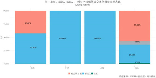 2020年四季度,根據對上海、廣州、成都、武漢等四個城市寫字樓租賃成交樣本的租戶進行分析,從交易市場來看,季度內來自TMT的行業需求占比持續領先;從租賃類型來看,寫字樓租賃交易以新租和搬遷為主,其中上海、廣州的新設立租戶租賃需求旺盛,武漢搬遷租戶數量超五成。