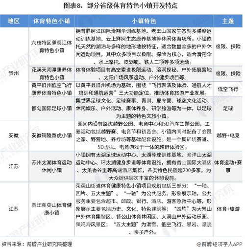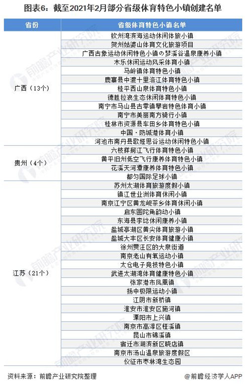 截至2021年2月,江蘇省共公布了三批共21家體育特色小鎮名單,浙江省共公布了三批共19家體育特色小鎮名單,廣西省公布了13家,貴州省公布了4家。
