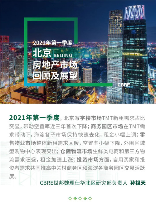 2021年第一季度,北京商務園區市場未錄得新增供應,個別原計劃入市的項目均推遲到今年年中交付。