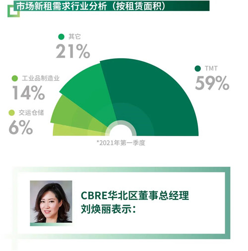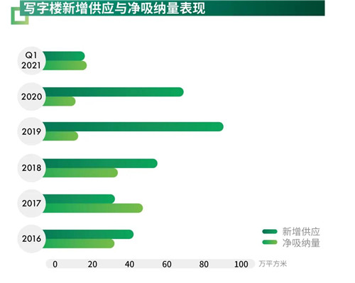 2021年第一季度,位于奧體、石景山和西直門區域的三個新項目交付使用,為寫字樓市場帶來共計15.3萬平方米的租賃面積。