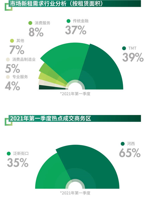 本季度凈吸納量環(huán)比大幅增長至20,879平方米。TMT產(chǎn)業(yè)的租賃成交占到了整體的38.6%,為優(yōu)質(zhì)寫字樓市場最活躍的租戶之一。另外,銀行、證券、信托及基金公司等金融租戶持續(xù)進(jìn)行布點,租賃交易面積占比達(dá)全市的37.0%。商業(yè)和交通配套持續(xù)升級的河西板塊仍是租戶選址熱點,本季度在全市租賃交易面積中的占比達(dá)到64.9%。