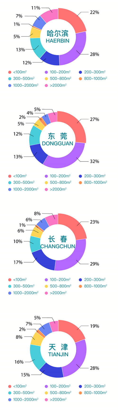 58安居客房產研究院還對用戶找房面積偏好進行了分析,哈爾濱選擇100-200㎡的辦公空間占比最多為28%,選擇小于100㎡的用戶占比為22%;東莞選擇100-200㎡的辦公空間的用戶為32%,高于選擇100㎡以下的用戶;同樣長春選擇100-200㎡辦公空間的用戶要高于100㎡以下的用戶;天津選擇小于100㎡的用戶占比為19%,選擇100-200㎡辦公空間的用戶占比為28%。總體來看,哈爾濱、東莞、長春和天津整體最受用戶關注的是100㎡以下及100-200㎡的辦公空間,可見小區域辦公空間仍為當下主流。