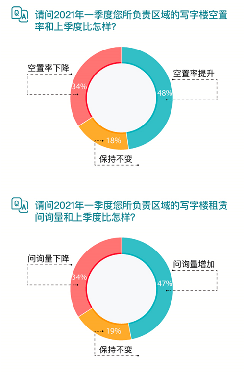 一直以來,經紀人對于市場變化極其敏銳,58安居客房產研究院調研數據顯示,2021年一季度商業地產經紀人信心指數為95.96,環比上漲12.5%。在接受調研的經紀人中,有48%的經紀人認為自己負責區域的寫字樓空置率提升,不過有47%的經紀人表示一季度的寫字樓問詢量增加。
