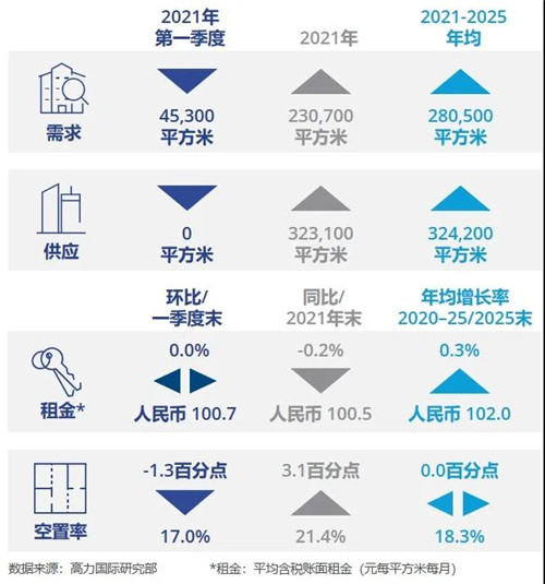 截至季末,全市甲級寫字樓市場錄得凈吸納量約4.5萬平方米。