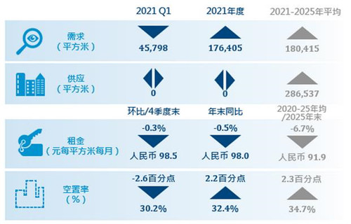 本季度西安甲級寫字樓市場未錄得新增供應。截至2021年第一季度,西安甲級寫字樓總存量與2020年第四季度持平,共約176.6萬平方米。