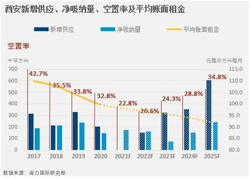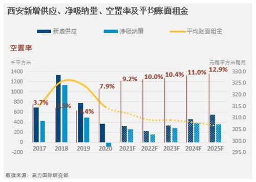 受部分項目開發交付節點影響,高力國際認為2021年仍是西安甲級寫字樓“去庫存”的一年,伴隨著市場需求的持續回暖,預計未來一年市場平均空置率將有較大幅度的下降。而自2022年起,市場將逐漸進入供應放量的通道,雖市場需求仍將保持相對穩定,但大量優質項目的入市將加速老舊項目以價換量的情況,致使租金仍將處于下行通道,降幅也將隨著供應的放量而放寬。