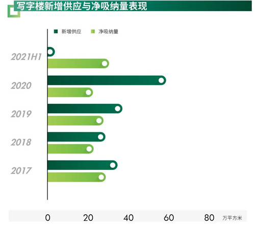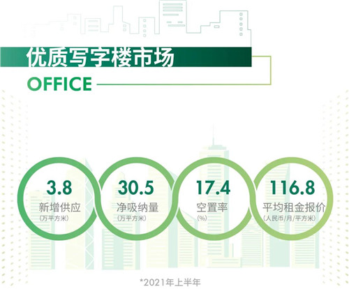 2021年上半年,杭州優質寫字樓市場共錄得一處新增供應項目—萬通時尚公館,位于未來科技城板塊,總體量約3.8萬平方米。上半年凈吸納量累計為30.5萬平方米,空置率較2020年末整體下降3個百分點至17.4%,杭州寫字樓市場整體發展態勢呈穩中向好。