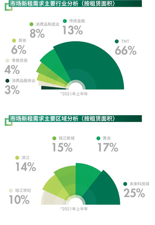 從各子板塊來看,未來科技城、黃龍、錢江新城、濱江是為推動寫字樓市場去化的主力。其中高科技企業聚集的黃龍板塊高品質樓宇供不應求,租金持續上升至每月每平方米168.2元,目前僅次于市中心的武林板塊。此外,得益于優良的TMT產業聚集氛圍及政策紅利優勢,作為新興市場代表—未來科技城板塊租賃成交活動同樣活躍,上半年凈吸納量共計近5萬平方米。從租戶行業分析,TMT(65.5%)及傳統金融(13.1%)為上半年兩大主力需求。TMT行業作為全市租賃市場成交核心主力,如字節跳動、快手、涂鴉科技、小店科技等多元化的綜合信息技術企業都有逾萬平方米的大體量成交發生。此外,傳統金融行業在核心區位如武林、錢江新城等板塊也表現活躍,尤以證券、基金類公司為主。