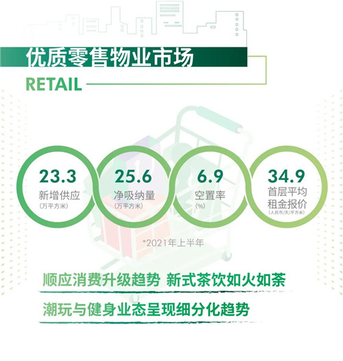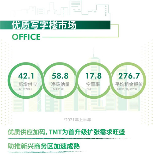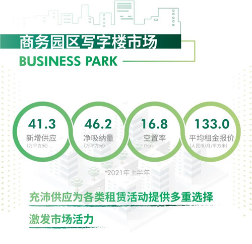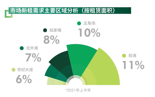 2021年上半年上海寫字樓市場供應恢復,同比增長245%。期待已久的濱江優質供應和各項優惠政策驅動市場升級擴張的進一步演化,整體凈吸納量已超去年全年水平。細分市場看,“十四五”重點推進的濱江發展帶如前灘,徐匯濱江和世博后灘上半年表現亮眼,前灘更已成為浦東空置率最低片區,錄得13.0%;核心拓展區及其次中心項目多點開花,品質升級需求漸增,多極發展態勢明顯;而核心商務區中陸家嘴和南京西路以內部同級搬遷擴租為主,表現較為積極。至此,全市空置率累計下調1.9%,至17.8%。