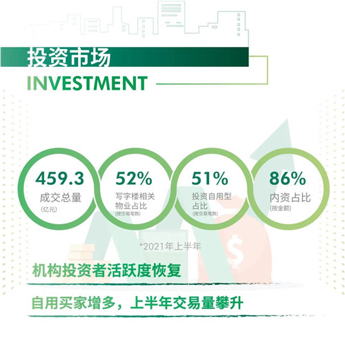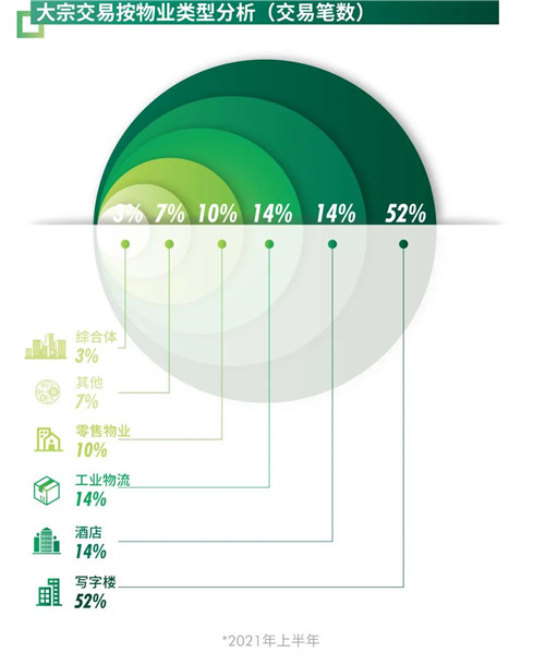 上半年上海大宗交易量穩居全國第一,大宗交易成交總額達459.3億元,同比增長16%。從成交筆數指標來看市場活躍度,全市累計錄得29筆大宗交易,投資意愿增強。從成交物業類型來看,寫字樓等相關物業與物流占據主導地位,占比分別為52%與14%。同時資產交易類型也更為廣泛,零售、酒店與倉儲以及數據中心的成交比例也較去年同期明顯回升,標志著后疫時代新一輪房地產周期或正拉開帷幕,投資者在繼續尋求穩健成長型資產的同時,正通過另類資產投資來優化房地產資產組合。