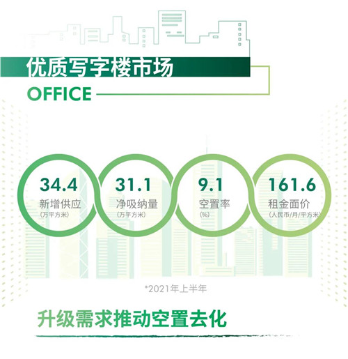 2021年第二季度,兩個(gè)甲級(jí)寫(xiě)字樓項(xiàng)目投入使用,分別位于珠江新城的萬(wàn)科中心和魚(yú)珠的行信中心,為市場(chǎng)帶來(lái)約15萬(wàn)平方米的寫(xiě)字樓面積。其中,萬(wàn)科中心是珠江新城近五個(gè)季度以來(lái)的首個(gè)新增辦公項(xiàng)目。行信中心則位于黃埔區(qū),在規(guī)劃中的廣州第二CBD之中。廣州上半年合共新增34萬(wàn)平方米優(yōu)質(zhì)辦公面積,同比增長(zhǎng)58%。
