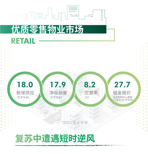 第二季度末由于疫情的爆發(fā),在接近一個(gè)月的時(shí)間里,廣州大部分行政區(qū)都停止了餐飲、培訓(xùn)和影院等體驗(yàn)業(yè)態(tài)的線(xiàn)下活動(dòng)。防疫措施影響了商場(chǎng)的人流。但就上半年而言,廣州優(yōu)質(zhì)零售物業(yè)市場(chǎng),仍在大致上延續(xù)了2020年下半年的復(fù)蘇態(tài)勢(shì),首層租金錄得0.9%的半年環(huán)比增長(zhǎng),至每日每平方米27.7元。供應(yīng)方面,第二季度沒(méi)有新增優(yōu)質(zhì)商業(yè)項(xiàng)目,上半年總供應(yīng)量為18萬(wàn)平方米。由于供應(yīng)的減少,半年凈吸納量環(huán)比下降44.9%,但空置率仍能錄得0.2個(gè)百分點(diǎn)的下跌,回落至第二季度末的8.2%。