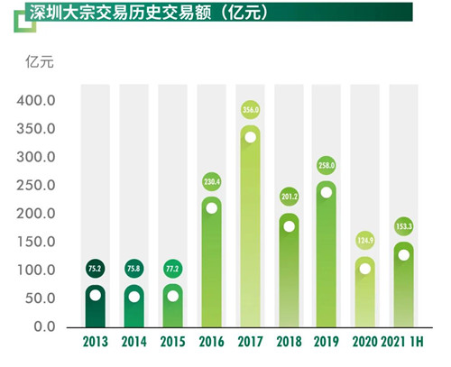 2021年上半年深圳大宗交易市場熱度激增,共錄得11宗成交,交易總額共計153.3億元,創歷史新高。